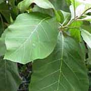 ด้านล่างสีเขียวเข้ม ด้านบนสีอ่อนกว่า ผิวใบมีขนสากมือ