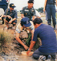 เสด็จพระราชดำเนินทอดพระเนตรการทดลองปลูกพันธุ์ไม้ป่าชายเลนในกะละมังพลาสติกในสภาพดิน