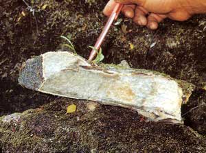 แสดงว่าผิวหินด้านนอกที่สัมผัสอากาศหรืคลุกอยู่กับดินมีการเปลี่ยนแปลงทำให้อ่อนยุ่งลงทำให้เห็นเป็นวงๆ